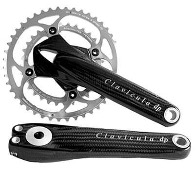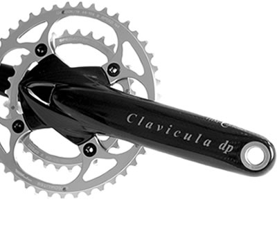 A double-chainring MTB crankset, the Clavicula dp, was presented at the Eurobike tradeshow. Details: 4-arm design, 104 mm BCD, 47.5 mm chainline (68 mm BB) / 50 mm chainline (73 mm BB), roughly 400 g (.88 lbs) w/o rings.