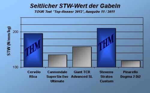 Die THM-Gabel im Cervelo R5ca beeindruckt mit seitlicher Steifigkeit und niedrigem Gewicht im Tour-Test „Top-Renner 2012“, Ausgabe Nr.11 2011. THM baut zudem die leichteste und seitensteifste Gabel im Testfeld für das Stevens Stratos Custom und verhilft dem Hamburger Fahrradanbieter mit ihrem neuen Topmodell erstmals an die Elite der Carbonrennräder anzuschließen.